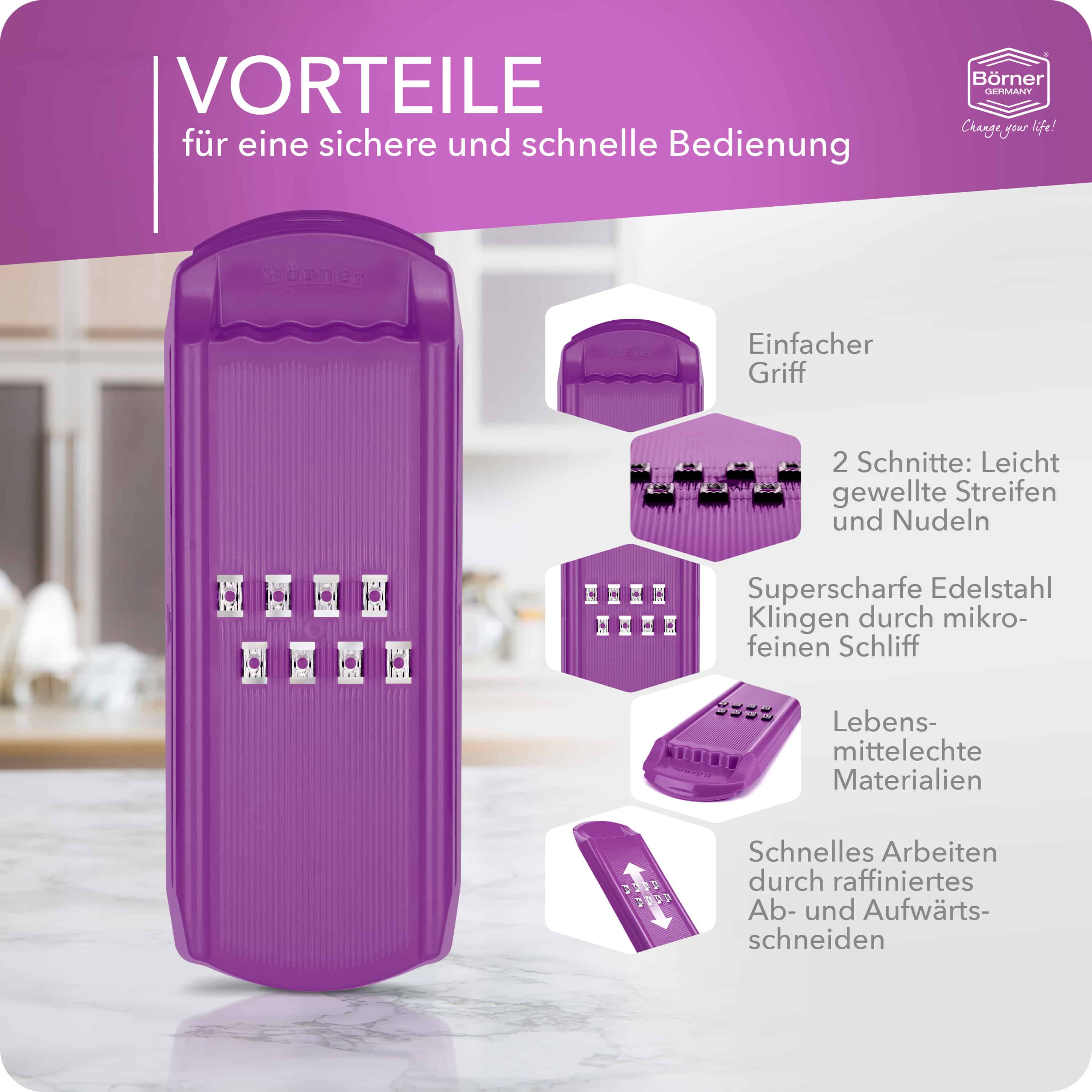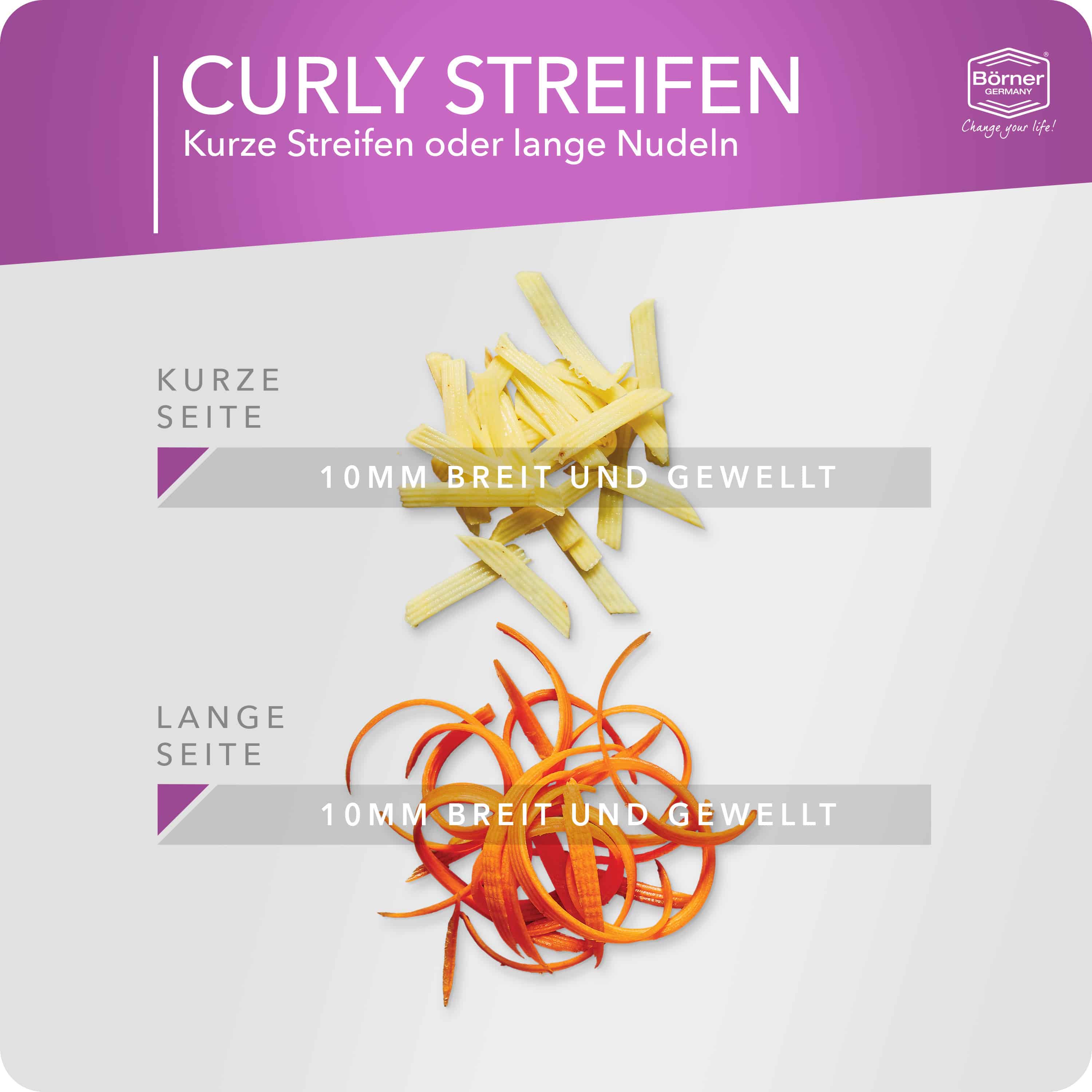 Mit dem Börner Curly DesignLine Streifenschneider lassen sich ganz einfach flache, ca. 1 cm breite und etwas gewellte Streifen herstellen. Nutzen Sie diese für asiatische Gemüsepfannen, geriffelte Pommes oder Salate oder als dekorative Elemente für kalte Platten. Mit dem Streifenschneider können Sie aber auch leckere Obst- oder Gemüsechips schneiden. Hierfür eignet sich der Curly super in Kombination mit dem Crispymaker. Geeignet ist die Wellenreibe für jegliche Art von Gemüse und Obst.
