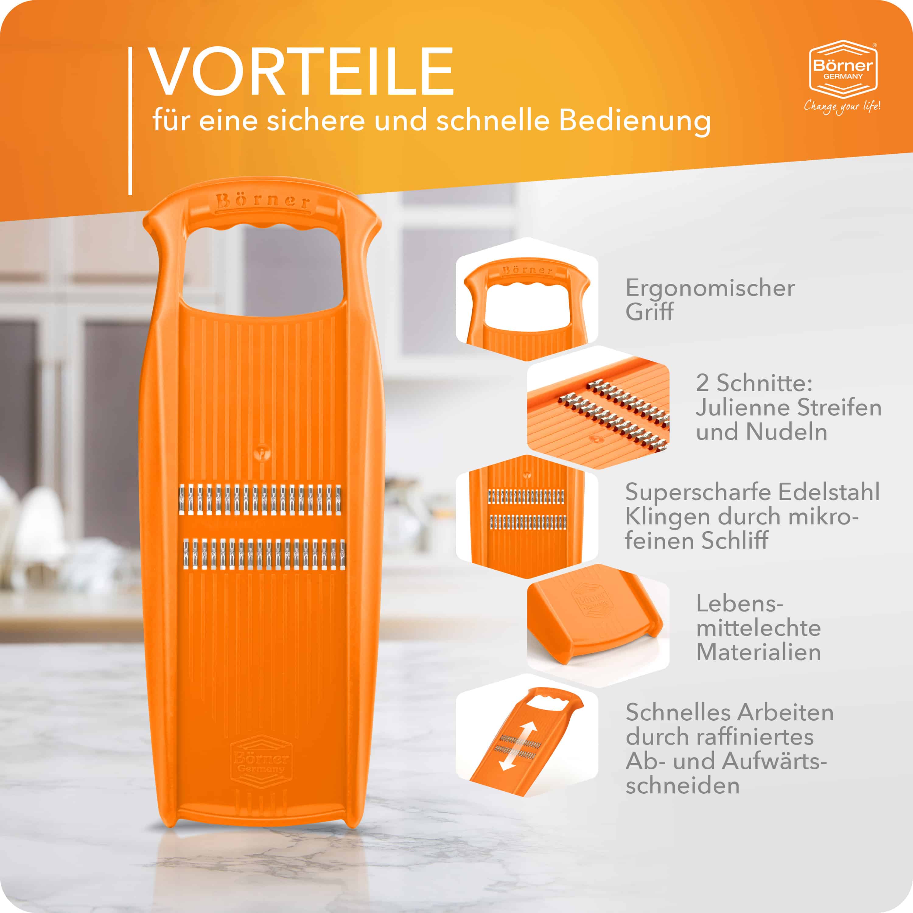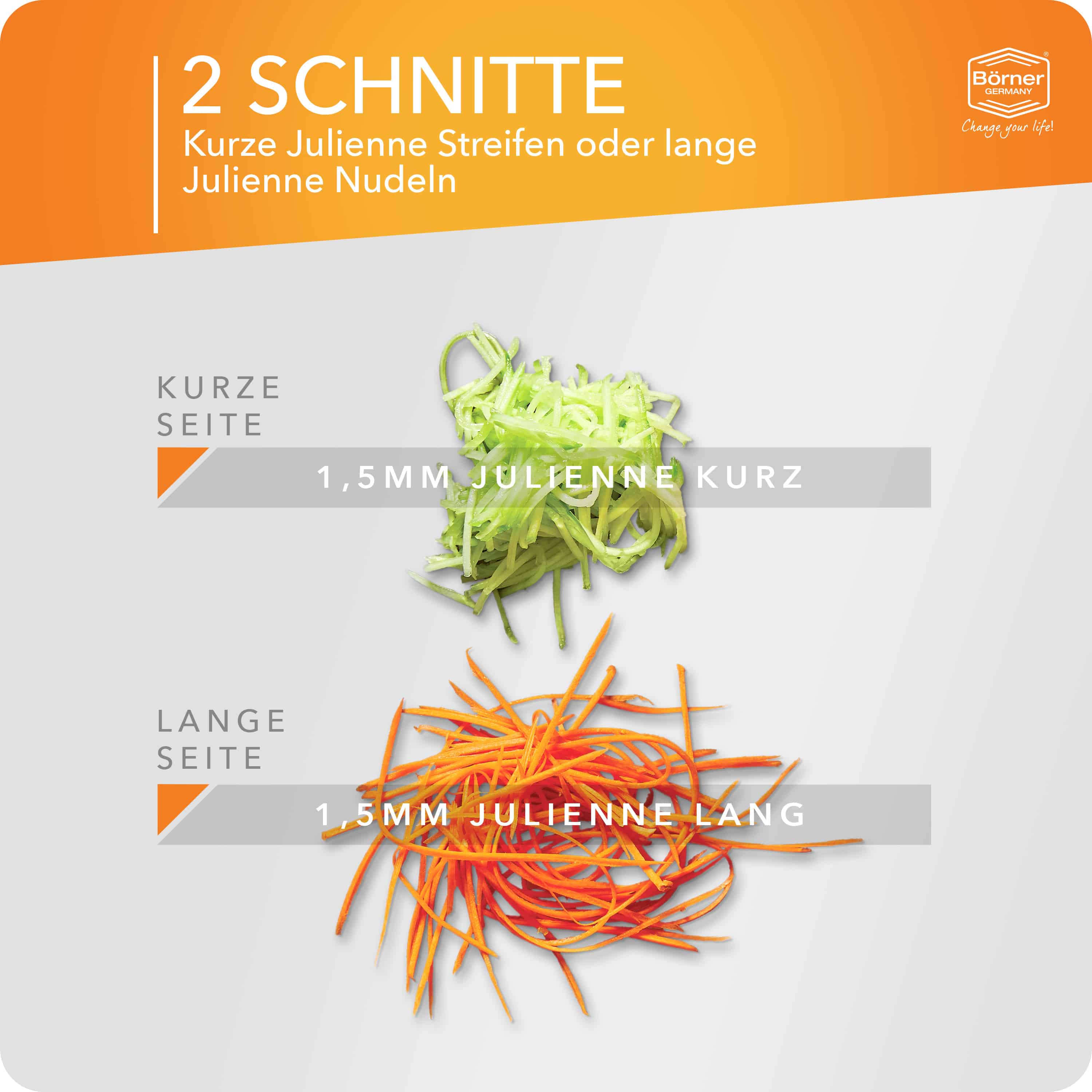 Mit der original Börner Roko-Reibe können Sie Obst und Gemüse in feine dünne Julienne-Streifen schneiden. Unser Julienneschneider schneidet Wurzelgemüse wie Karotten, Sellerie, Pastinaken oder Kohlrabi, aber auch Kartoffeln oder Gurken lassen sich reiben und zu feinen Julienne-Streifen z. B. für Rohkost-Salate verarbeiten. Die beidseitig geschliffenen Klingenreihen schneiden in kürzester Zeit große Mengen, da in beide Richtungen geschnitten werden kann. Perfekt geeignet ist der Julienneschneider für die Zubereitung von Gemüsepfannen wie z. B. Wokgemüse. Außerdem kann die Roko Powerline ideal als Zucchini Spaghetti Schneider verwendet werden und leckere Gerichte zaubern.