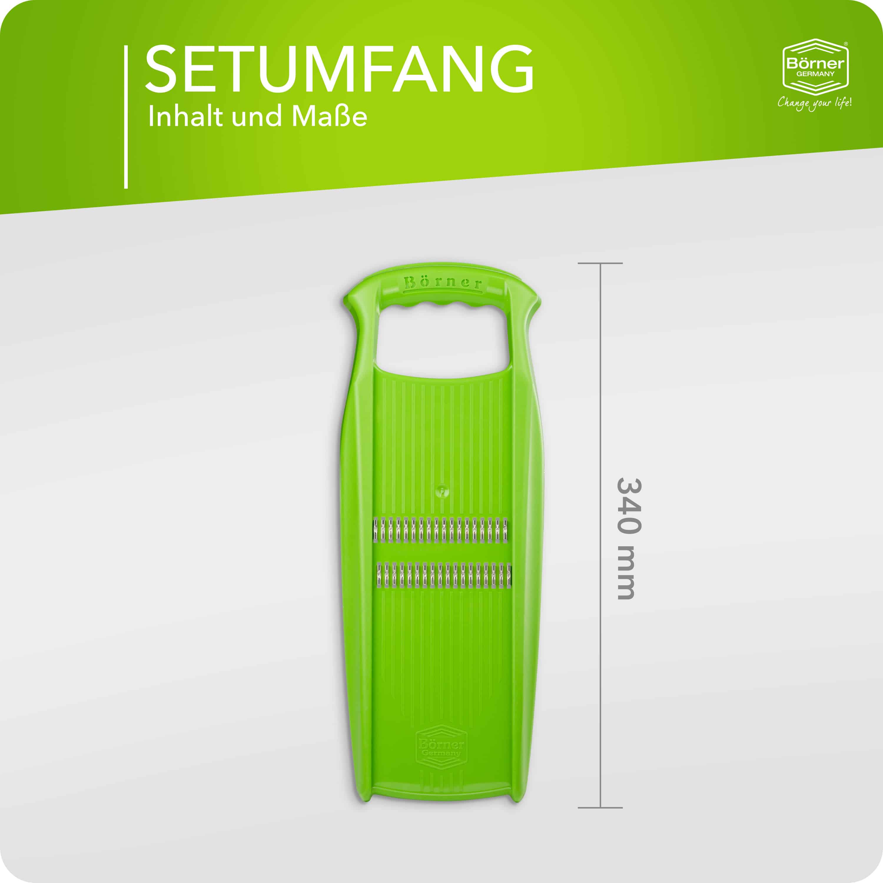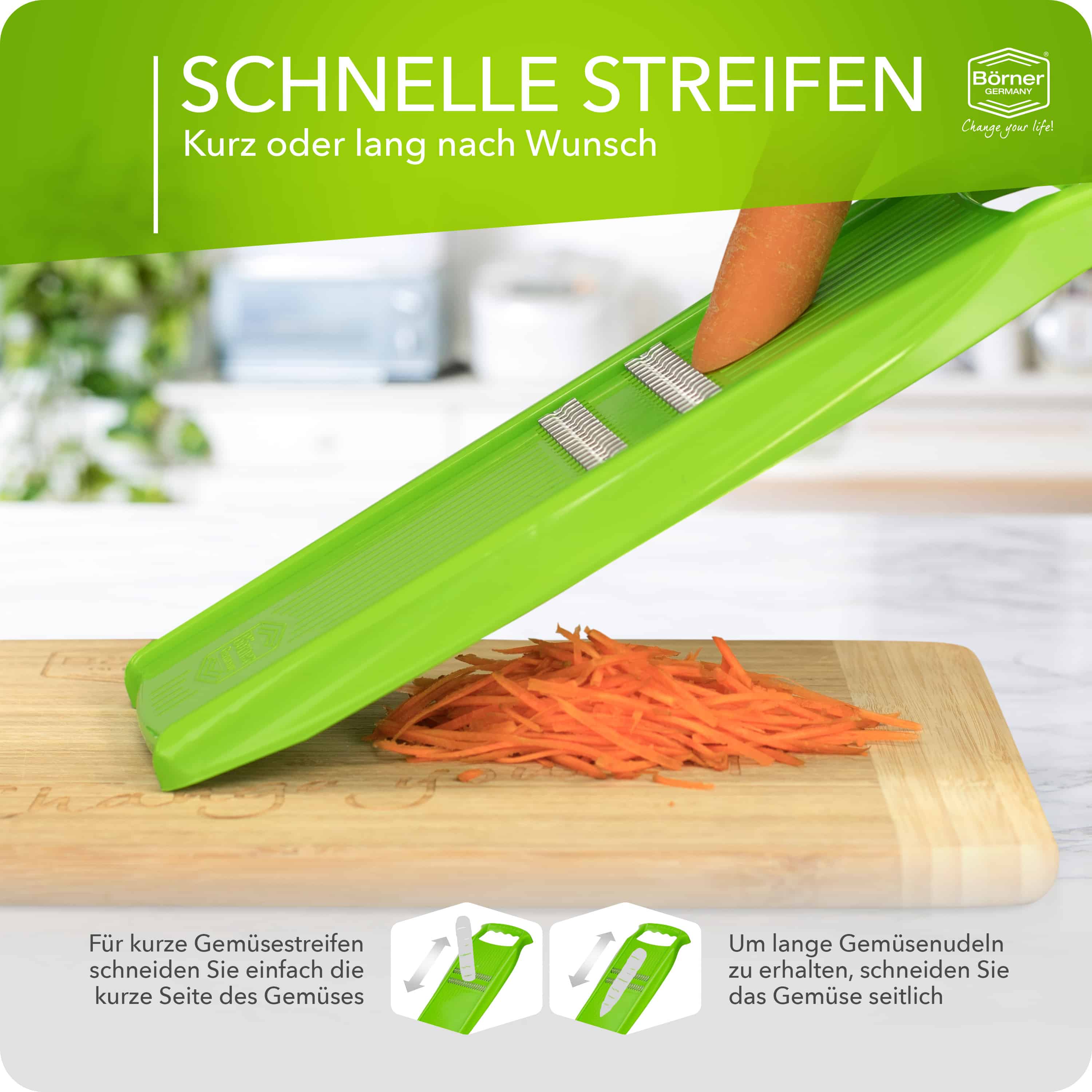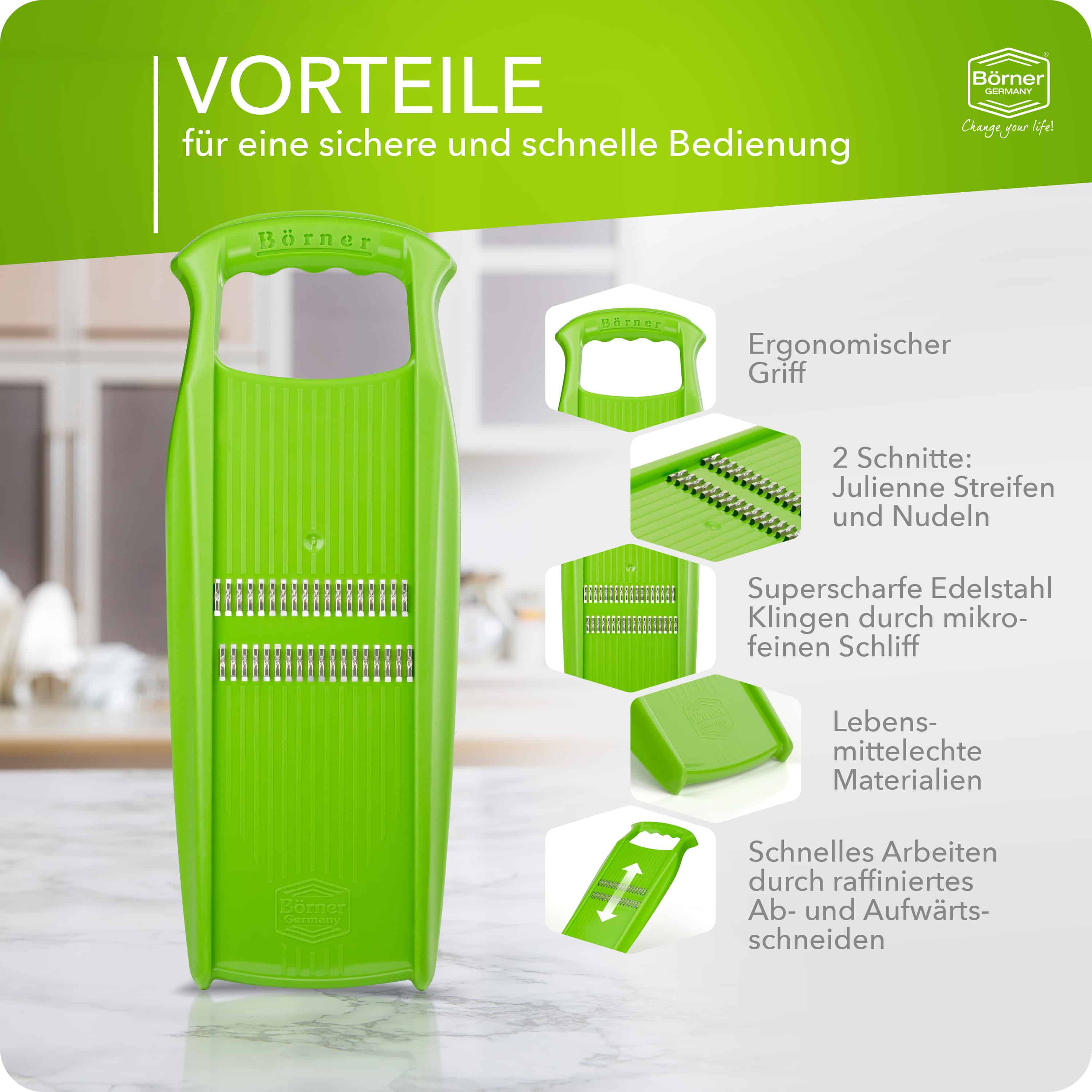 Mit der original Börner Roko-Reibe können Sie Obst und Gemüse in feine dünne Julienne-Streifen schneiden. Unser Julienneschneider schneidet Wurzelgemüse wie Karotten, Sellerie, Pastinaken oder Kohlrabi, aber auch Kartoffeln oder Gurken lassen sich reiben und zu feinen Julienne-Streifen z. B. für Rohkost-Salate verarbeiten. Die beidseitig geschliffenen Klingenreihen schneiden in kürzester Zeit große Mengen, da in beide Richtungen geschnitten werden kann. Perfekt geeignet ist der Julienneschneider für die Zubereitung von Gemüsepfannen wie z. B. Wokgemüse. Außerdem kann die Roko Powerline ideal als Zucchini Spaghetti Schneider verwendet werden und leckere Gerichte zaubern.