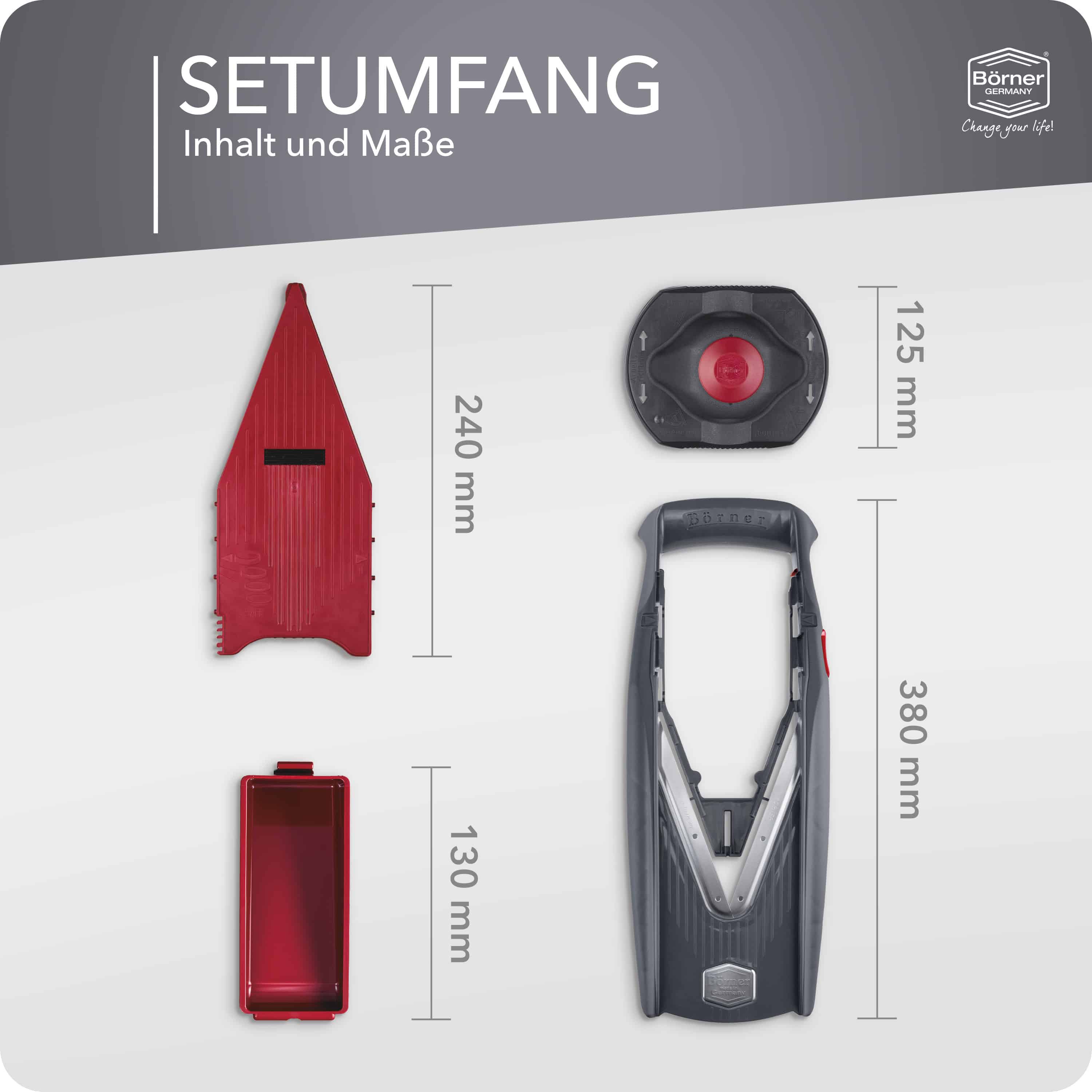 Der Vital ist die Weiterentwicklung der Börner V5 Mandoline. Aufgrund ihrer innovativen Marinier-Rolle ermöglicht die Vital Multireibe nicht nur das Schneiden von Scheiben in vier verschiedenen Dicken, sondern kann das Gemüse gleichzeitig mit Dressing versorgen, sodass der fertige Salat, inklusive der optimalen Menge an Dressing, schon in der Schüssel landet. Durch die noch größere Zeitersparnis sowie die perfekt dosierte Menge an Dressing wird die Vital Mandoline zum absoluten Alleskönner.
