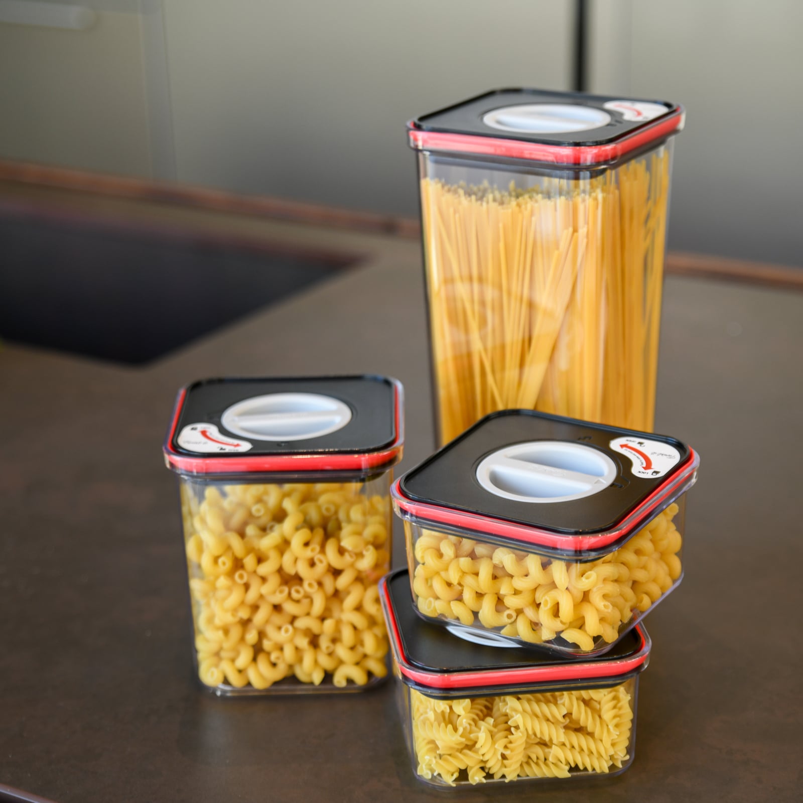 Die “Twist it” Vorratsbehälter vereinen Stil und Funktionalität in einem modernen und einzigartigen Design. Dank ihrer quadratischen Form sind sie besonders platzsparend und lassen sich mühelos stapeln – ideal für eine aufgeräumte Küche. Die Behälter sind transparent, sodass Sie immer den Inhalt im Blick haben.