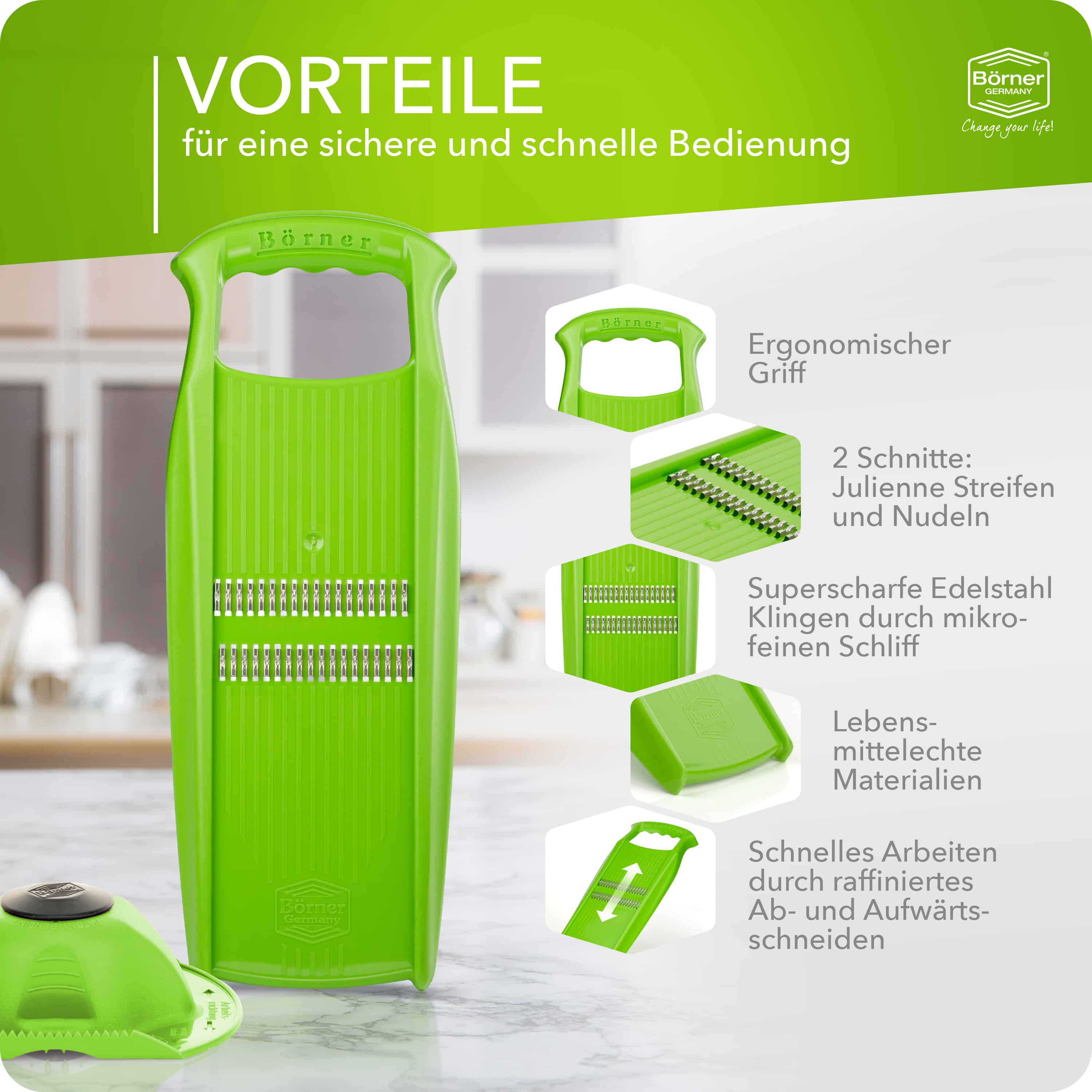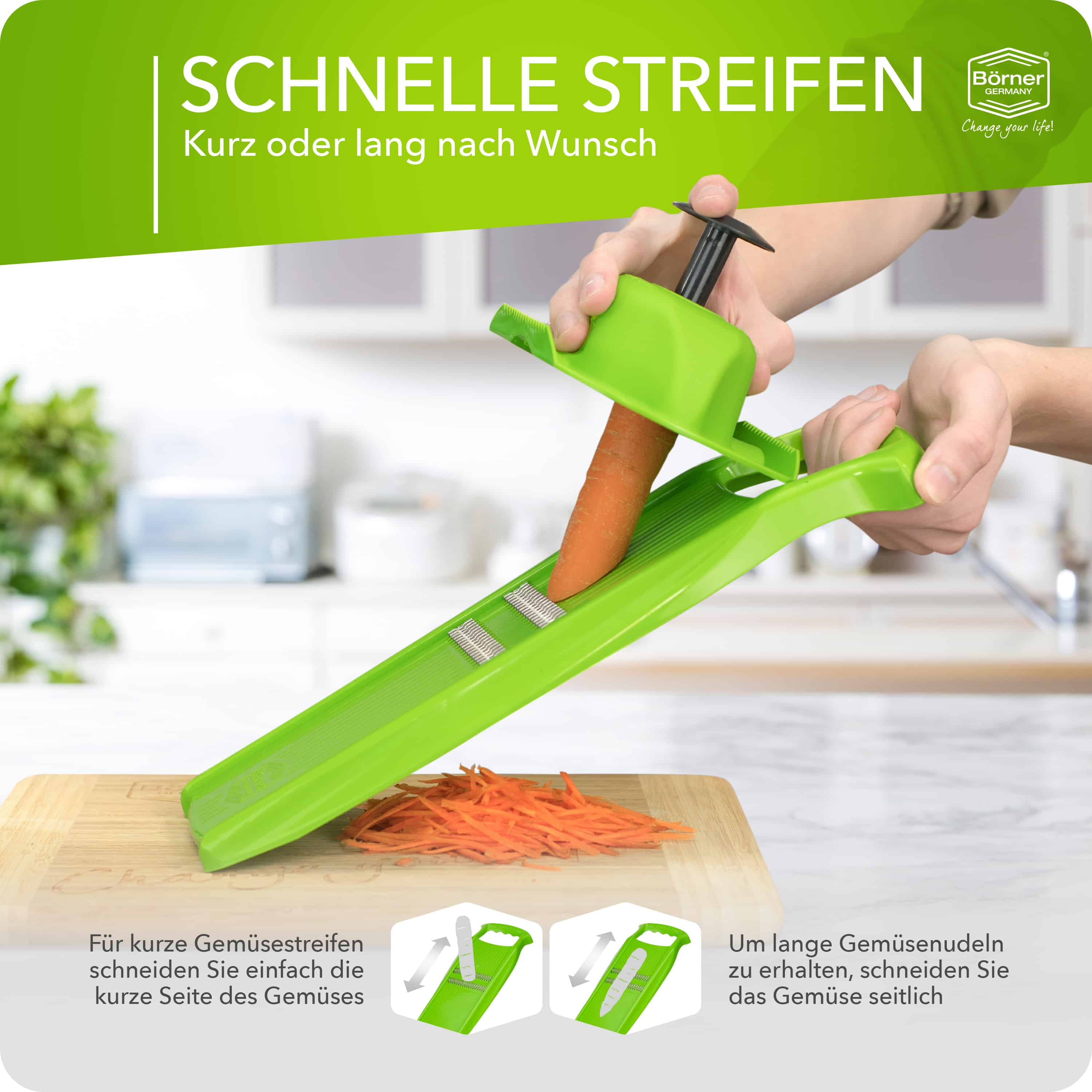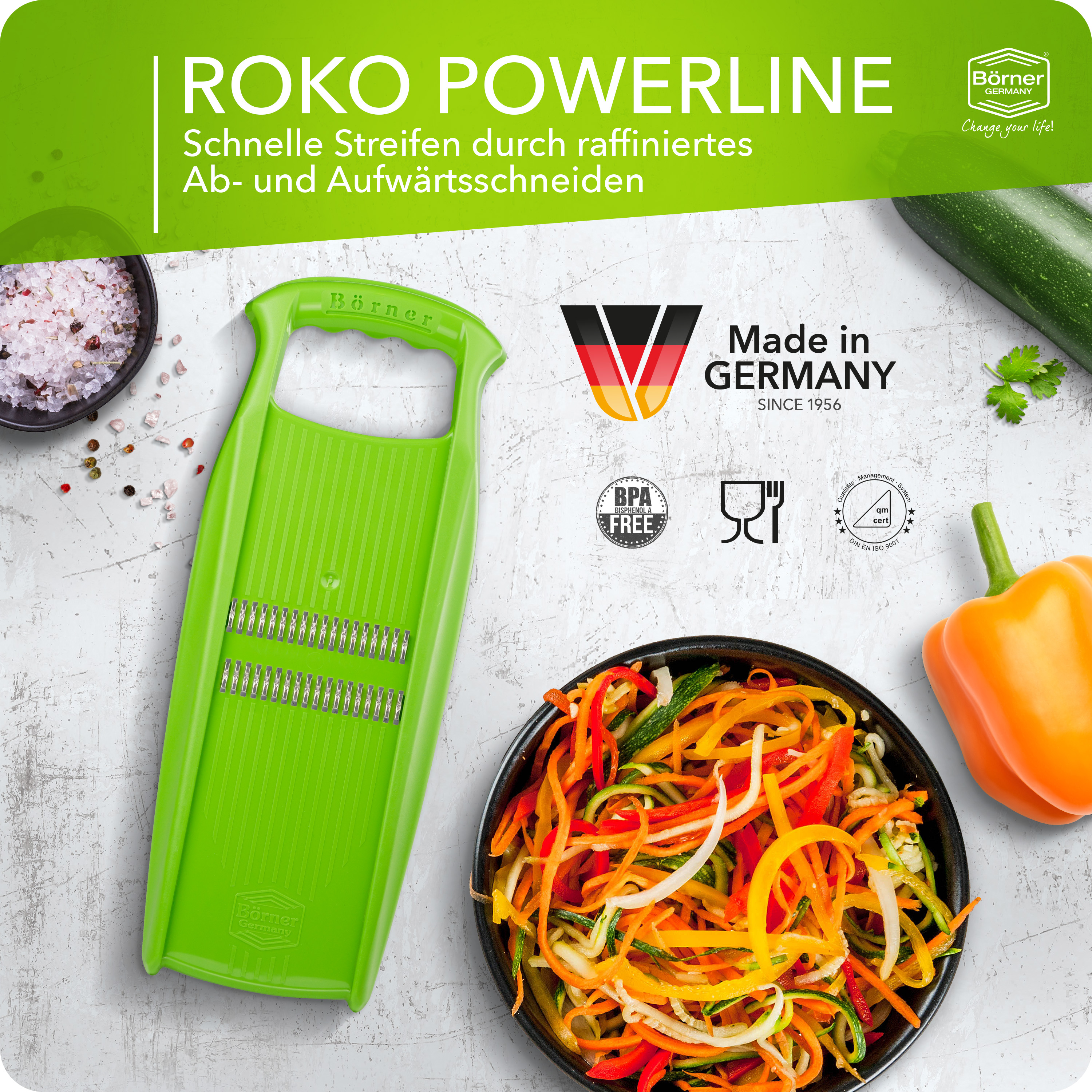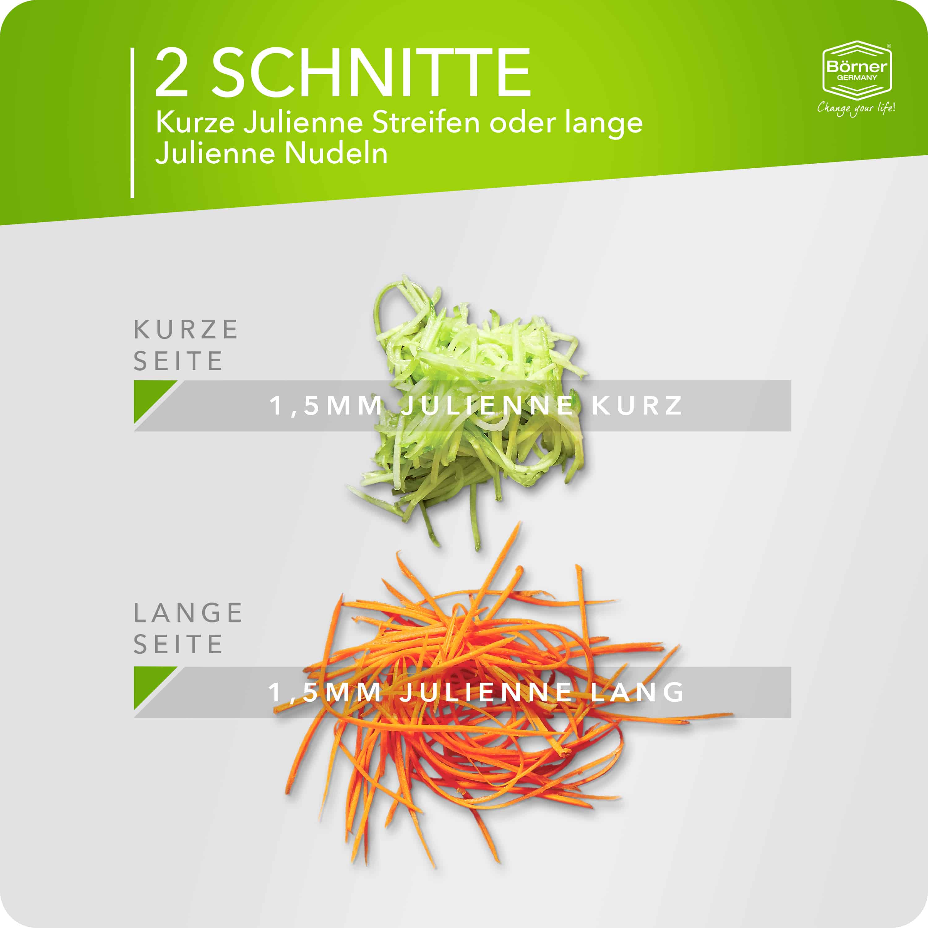 Mit der original Börner Roko-Reibe können Sie Obst und Gemüse in feine dünne Julienne-Streifen schneiden. Unser Julienne Schneider schneidet Wurzelgemüse wie Karotten, Sellerie, Pastinaken oder Kohlrabi. Aber auch Kartoffeln oder Gurken lassen sich reiben und zu feinen Julienne-Streifen z.B. für Rohkost-Salate verarbeiten. Die beidseitig geschliffenen Klingenreihen schneiden in kürzester Zeit große Mengen, da in beide Richtungen geschnitten werden kann. Perfekt geeignet ist die Julienne Reibe für die Zubereitung von Gemüsepfannen wie z.B. Wokgemüse. Außerdem kann die Roko Powerline ideal als Zucchini Spaghetti Schneider verwendet werden und leckere Gerichte zaubern.