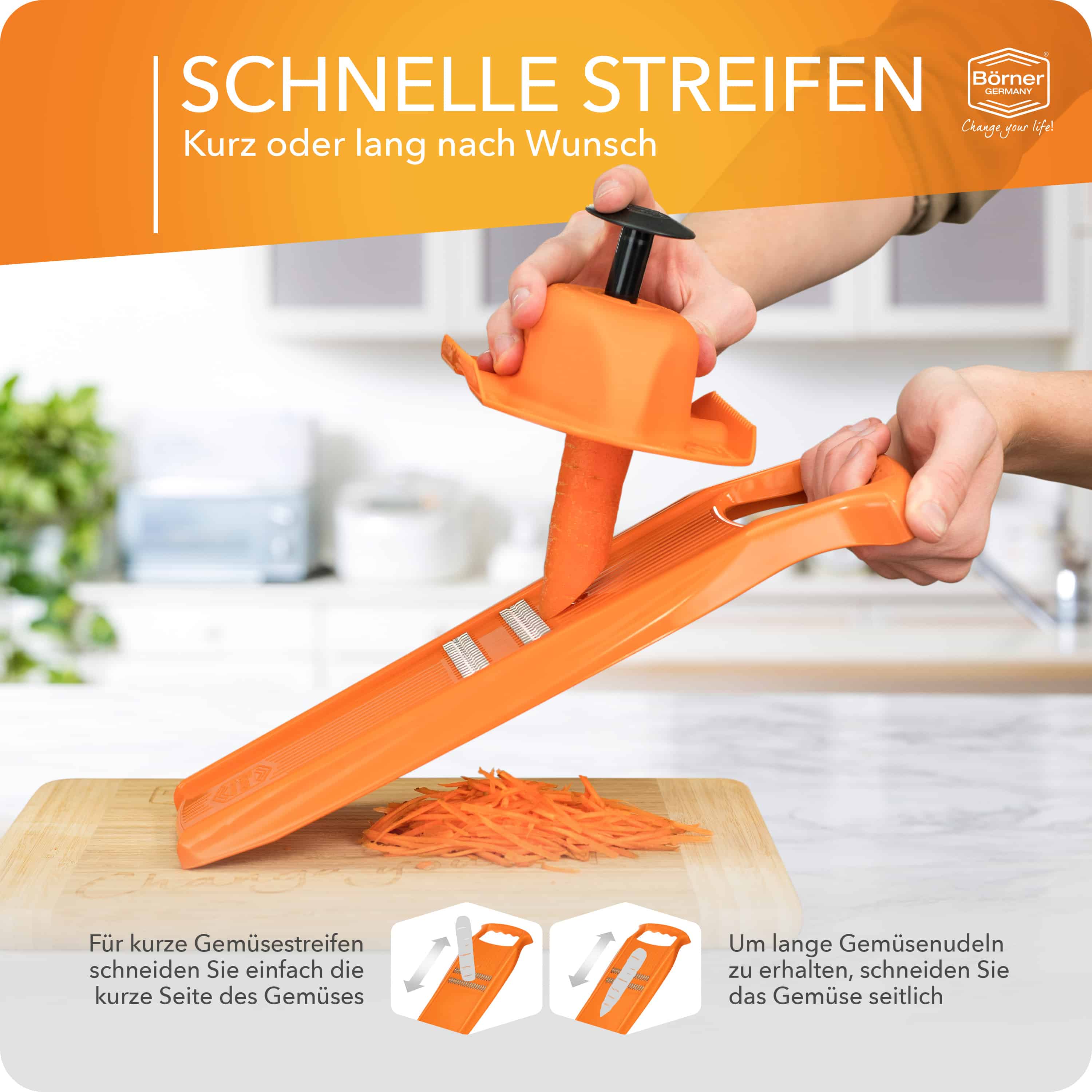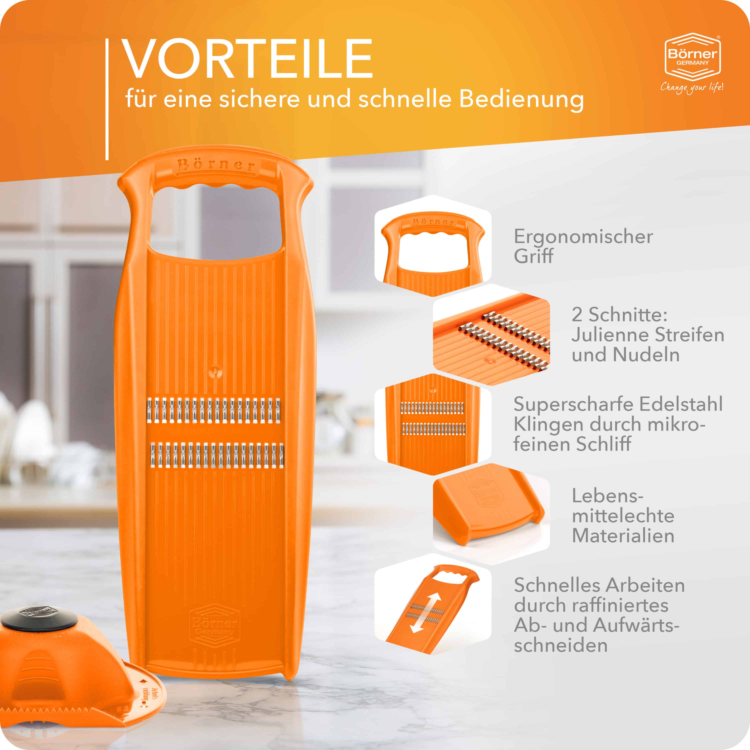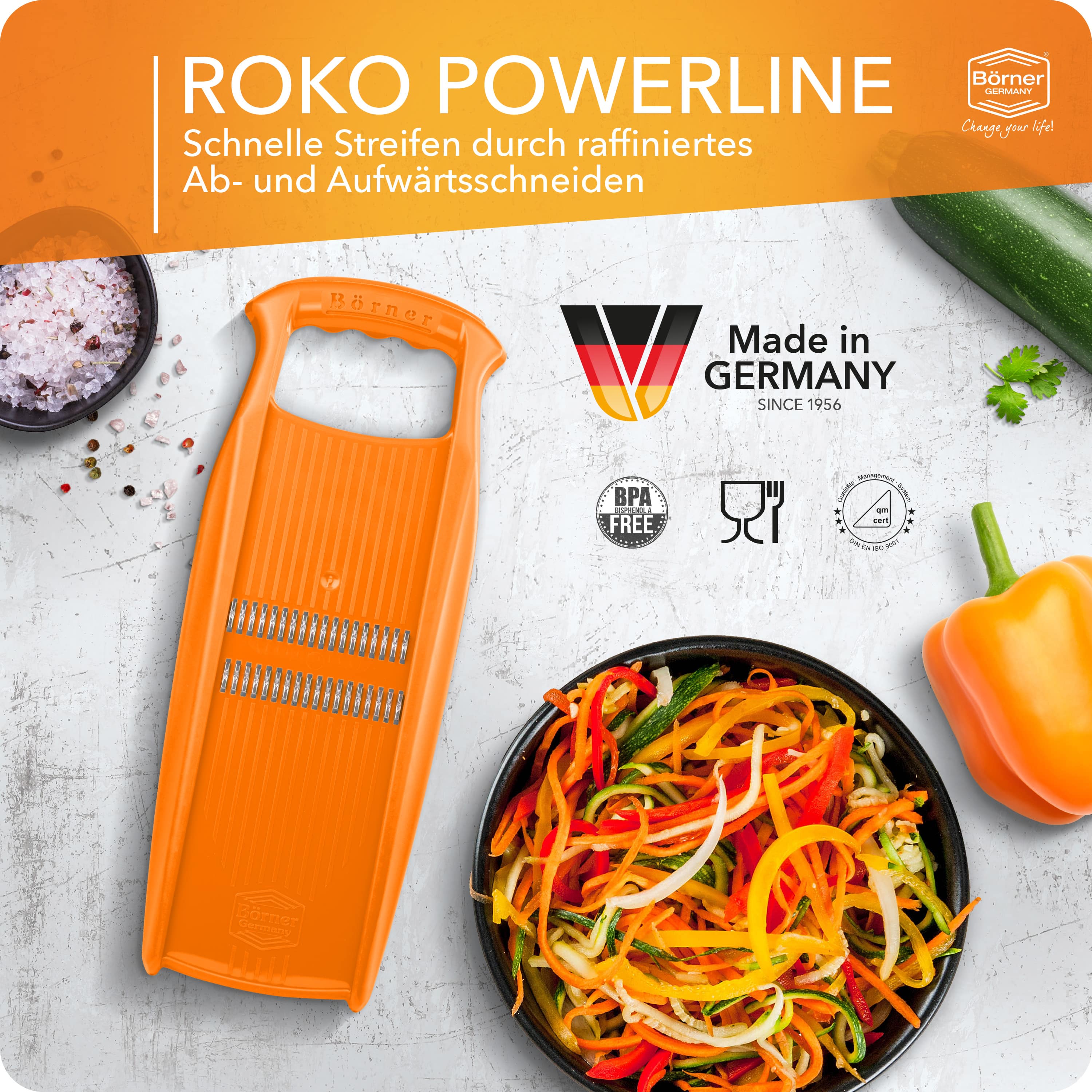 Mit der original Börner Roko-Reibe können Sie Obst und Gemüse in feine dünne Julienne-Streifen schneiden. Unser Julienne Schneider schneidet Wurzelgemüse wie Karotten, Sellerie, Pastinaken oder Kohlrabi. Aber auch Kartoffeln oder Gurken lassen sich reiben und zu feinen Julienne-Streifen z.B. für Rohkost-Salate verarbeiten. Die beidseitig geschliffenen Klingenreihen schneiden in kürzester Zeit große Mengen, da in beide Richtungen geschnitten werden kann. Perfekt geeignet ist die Julienne Reibe für die Zubereitung von Gemüsepfannen wie z.B. Wokgemüse. Außerdem kann die Roko Powerline ideal als Zucchini Spaghetti Schneider verwendet werden und leckere Gerichte zaubern.