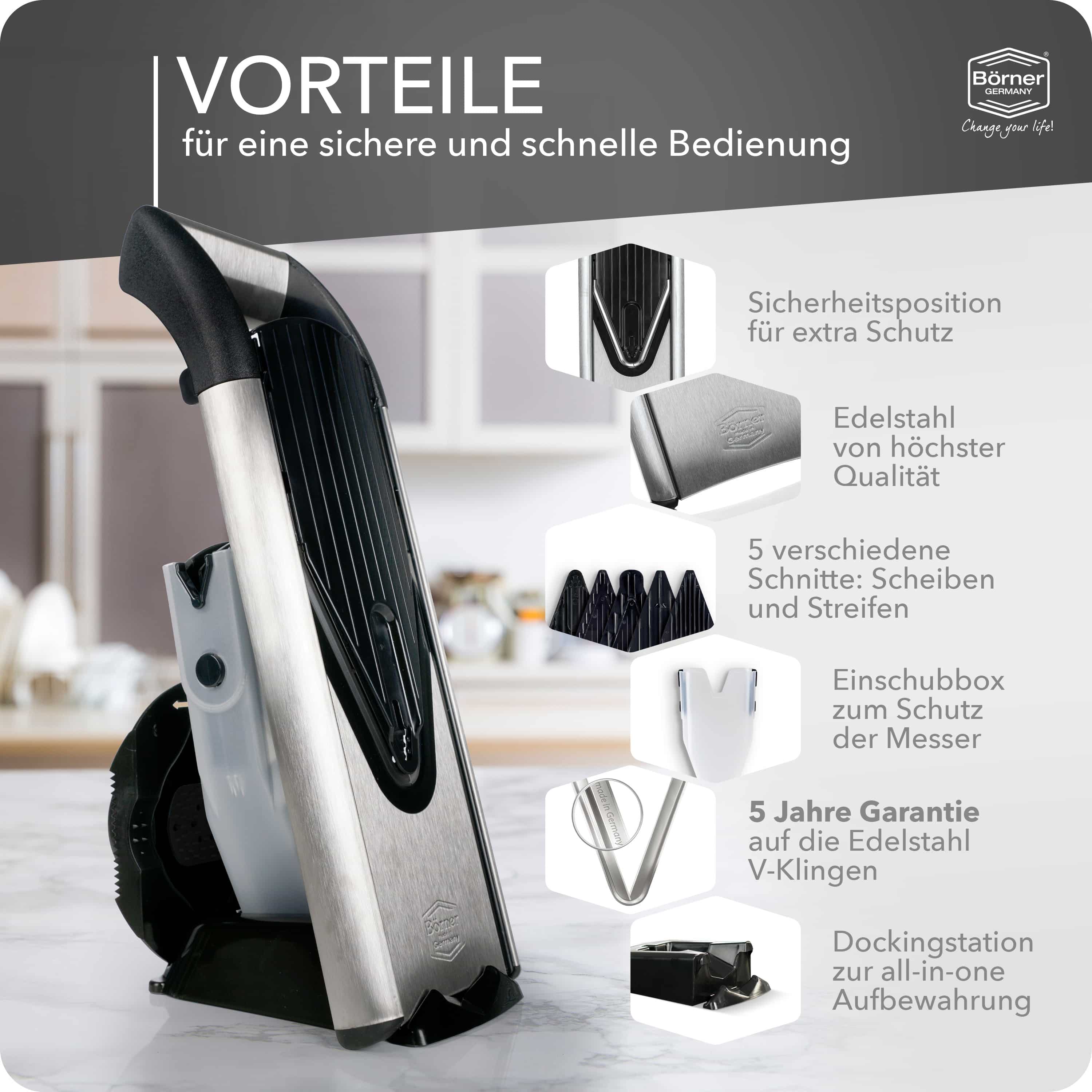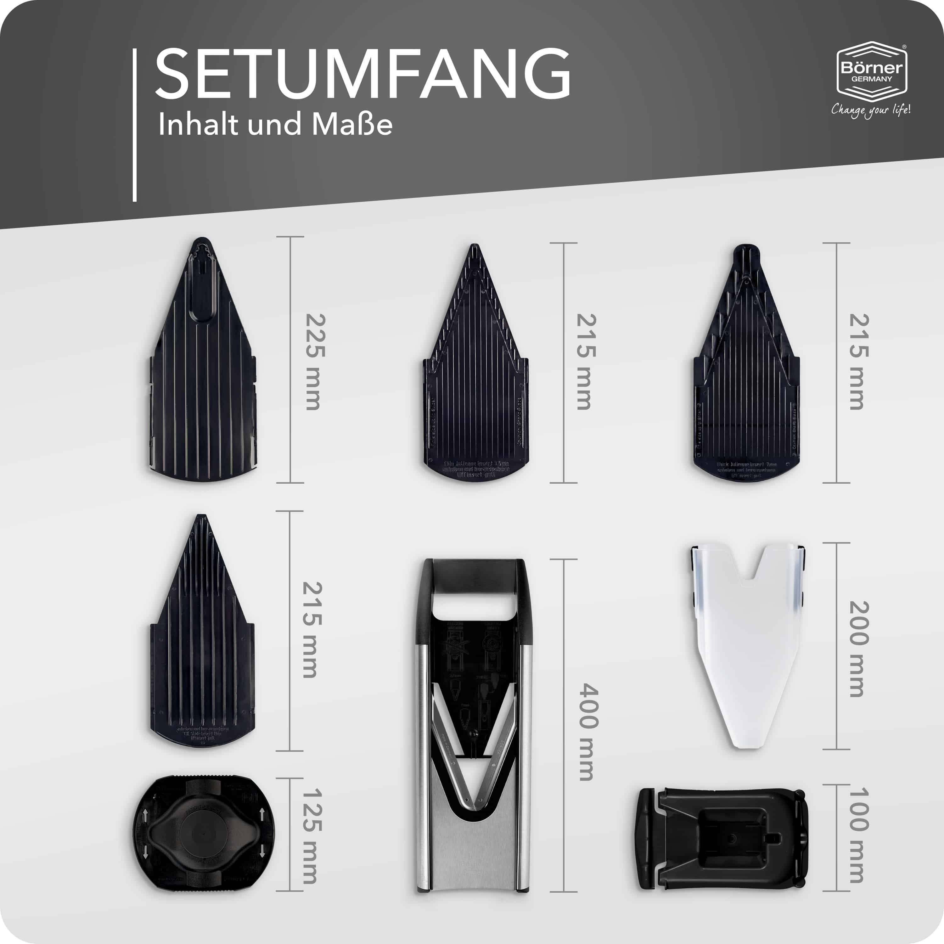 Bestandteile des Börner Gemüsehobels Edelstahl V6 ExcusiveLine Profi Sets: