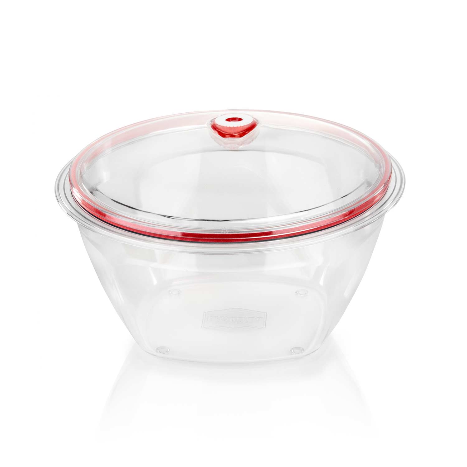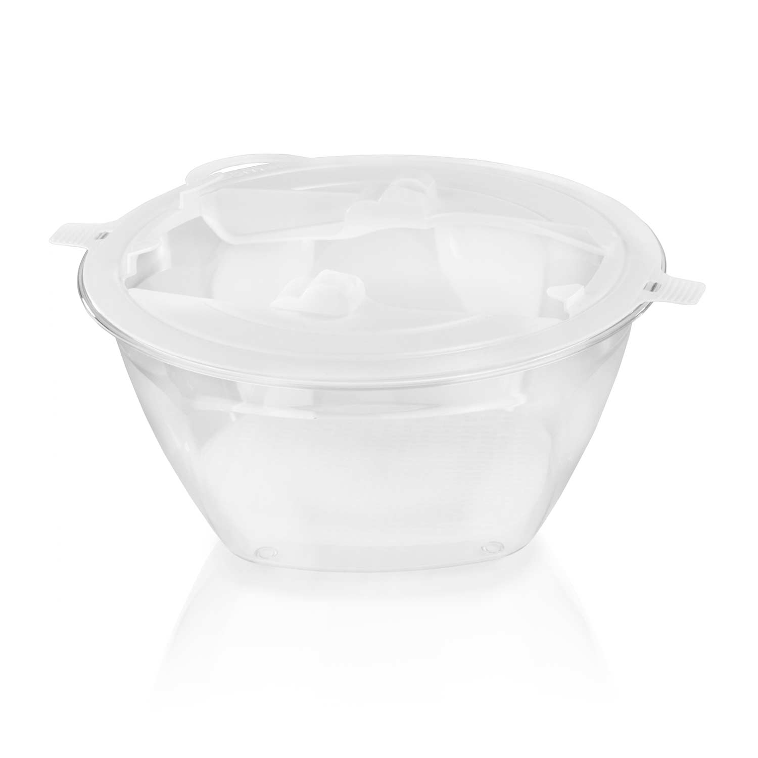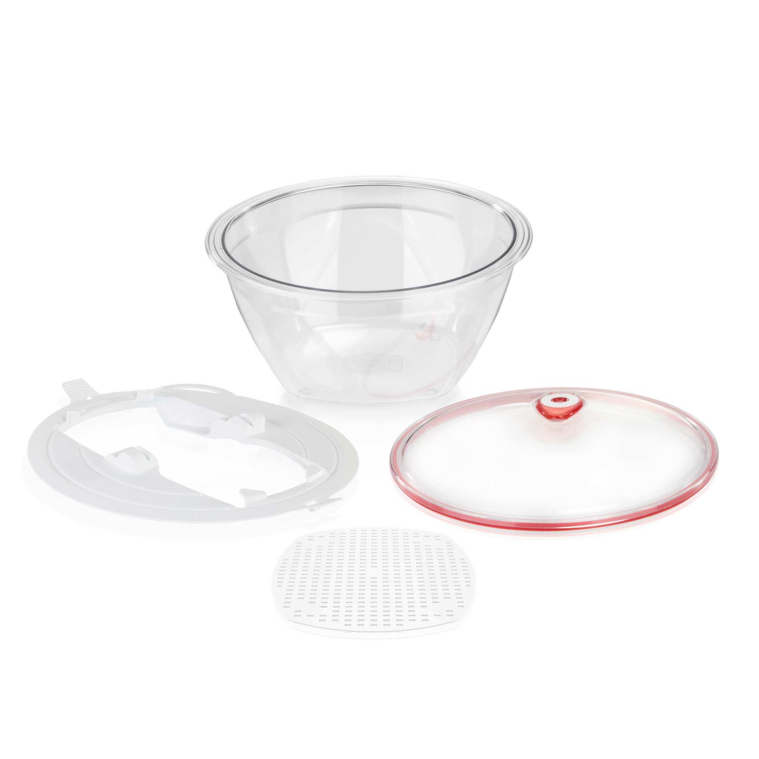Durch das integrierte Sieb können Sie frisch gewaschene Tomaten, Beeren oder Salat einfach und bequem abtropfen lassen. Servieren Sie Freunden und Familie frisches Obst direkt in der durchsichtigen Schüssel. Nutzen Sie außerdem den Frischhaltedeckel, um Ihre Lebensmittel lange frisch zu halten. So haben Sie immer einen gesunden Snack oder die Bestandteile einer gesunden Mahlzeit zur Hand.