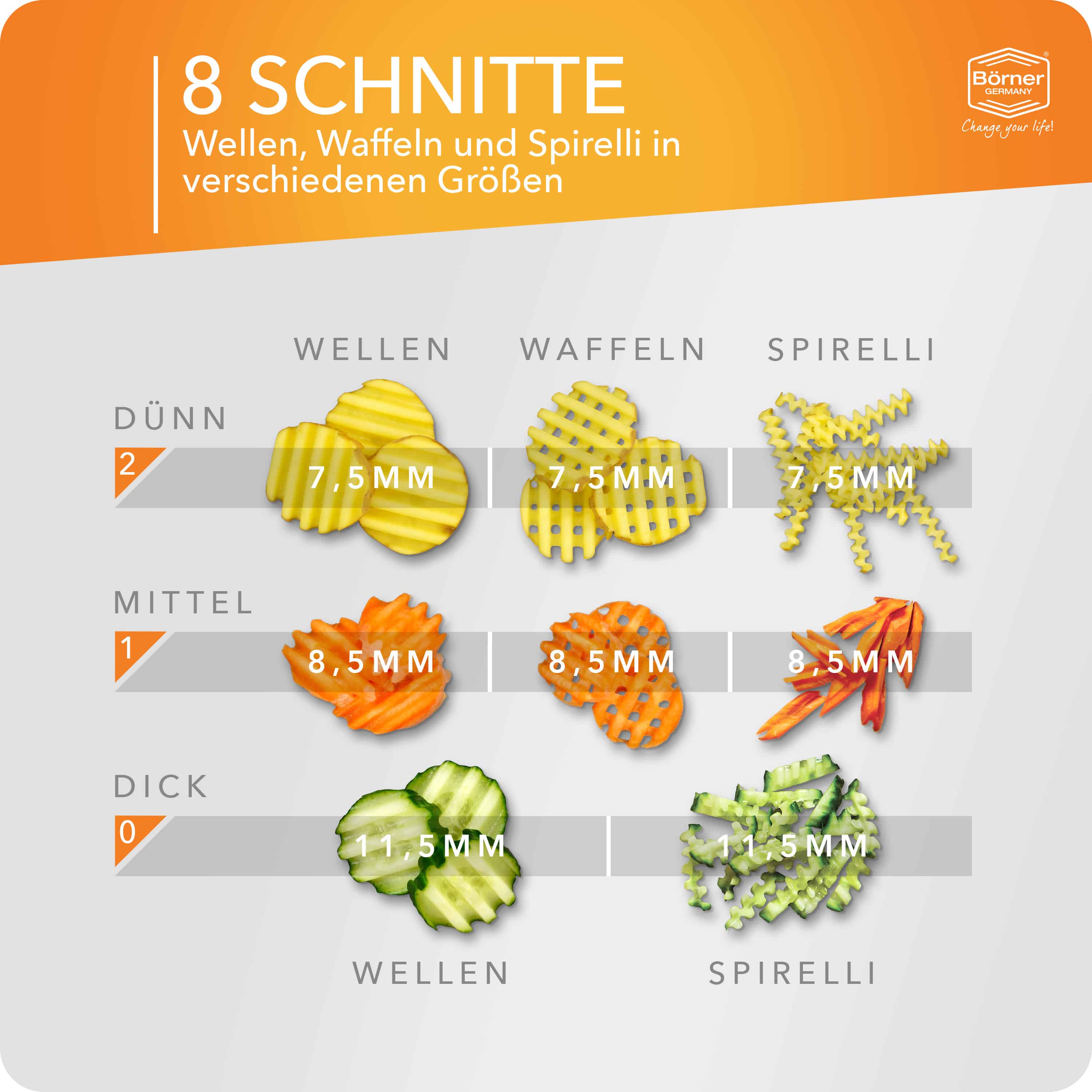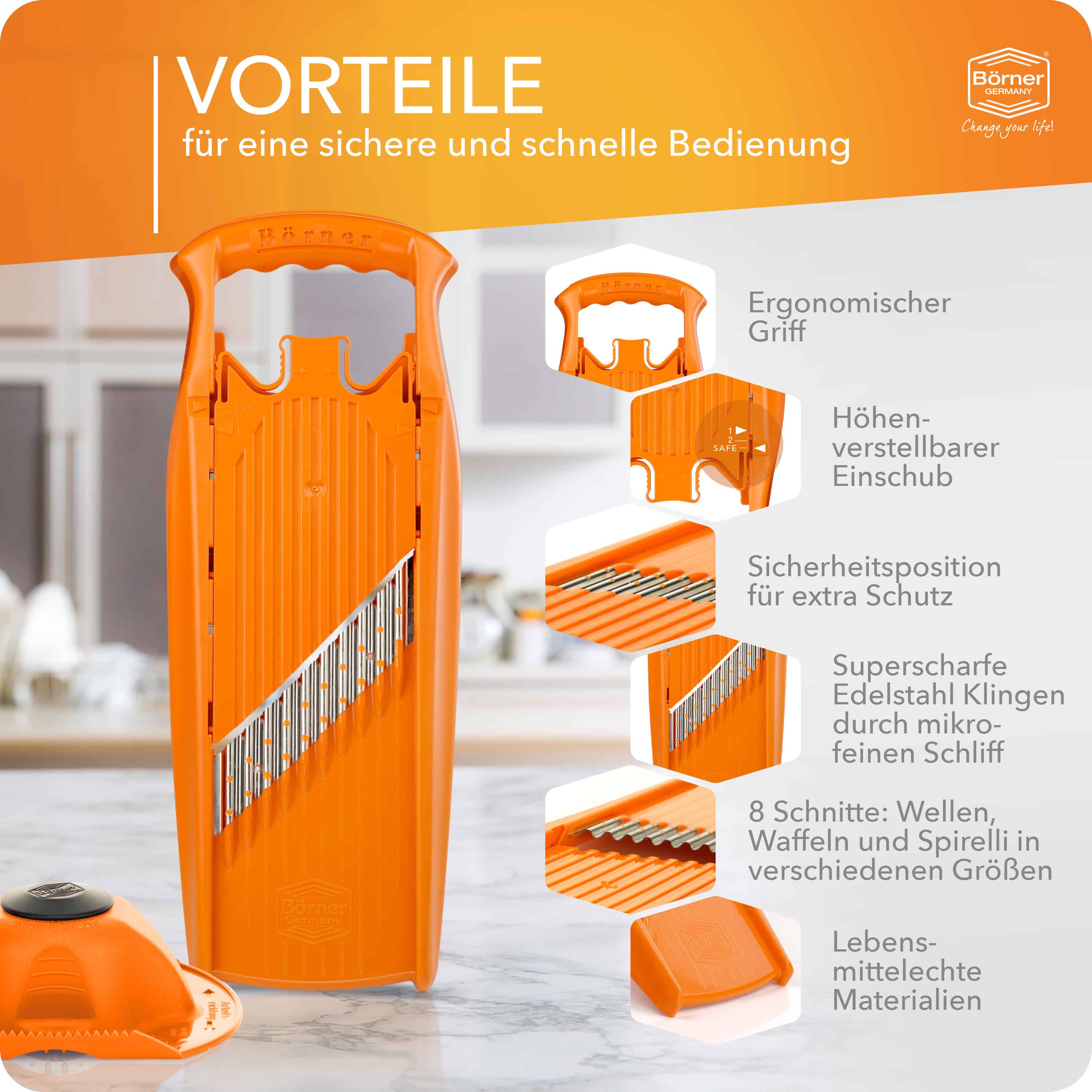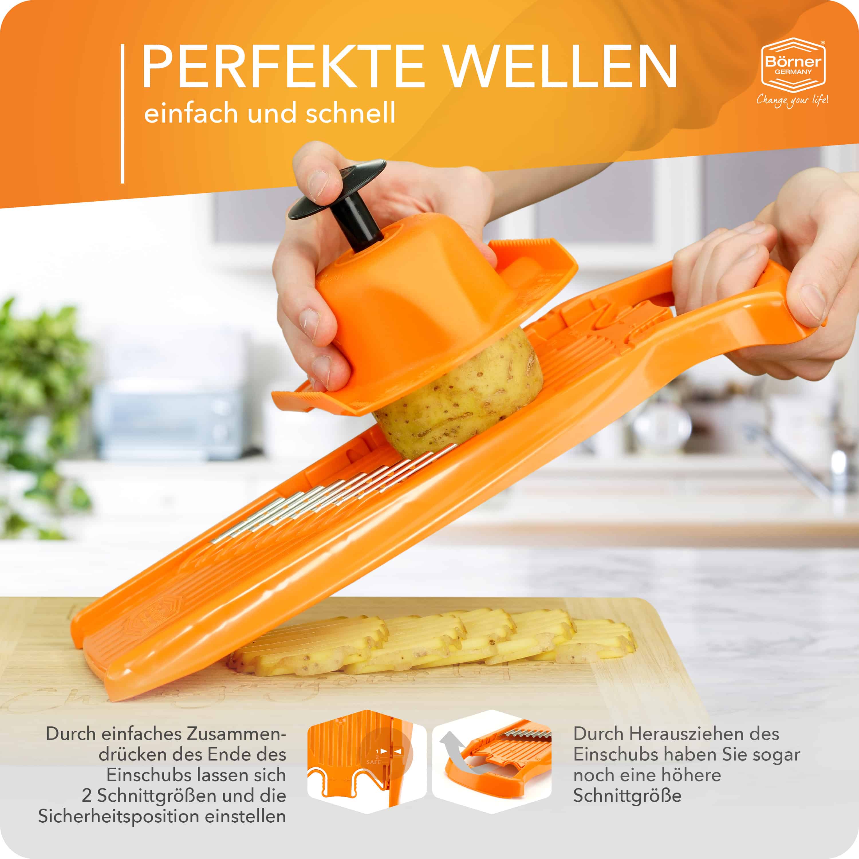 Mit dem original Börner Welle-Waffel PowerLine schneiden Sie Obst und Gemüse unkompliziert und schnell in Wellen- und Waffelform in drei verschiedenen Stärken. Der beliebte Börner Wellenschneider ist ideal für die Zubereitung von leckeren Gitterkartoffeln oder Wellenschnitt Pommes. Außerdem bringt die ausgefallene Optik Abwechslung auf Ihren Teller. Besonders für Familien mit Kindern ist der Wellenschneider interessant. Durch die ausgefallene Form lassen sich Äpfeln, Karotten und vieles mehr als besonders ansehnliche Beilagen im Wellen- oder Waffelschnitt zubereiten, die auch Ihre Kinder von gesundem Essen überzeugen.
