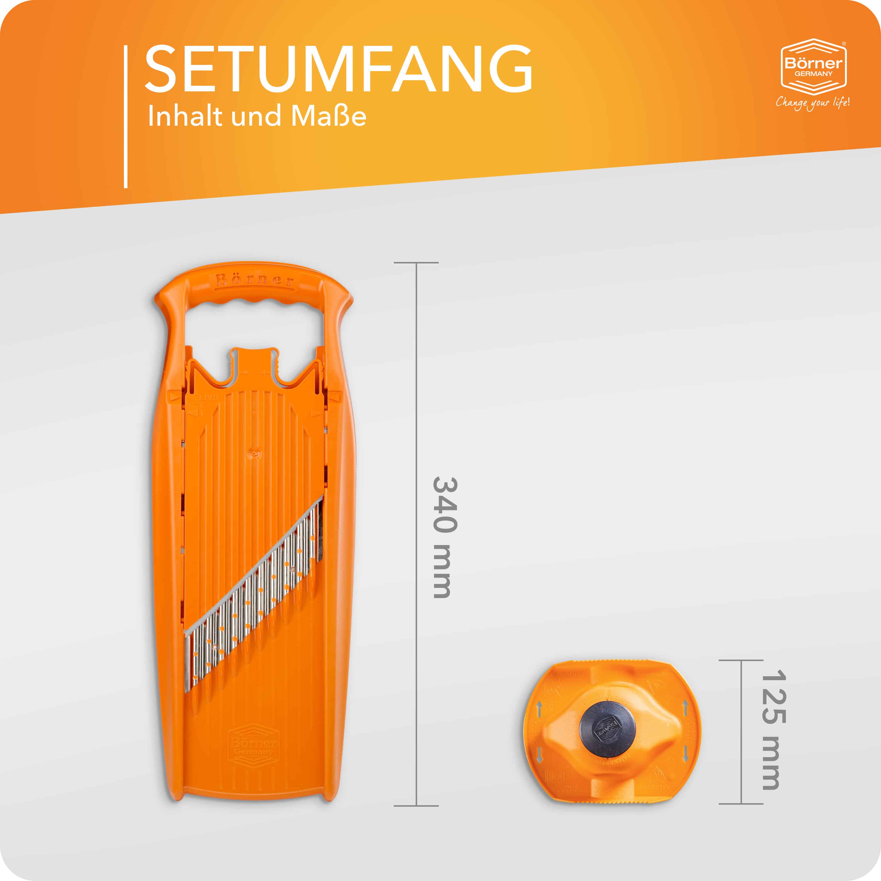 Dieses Set beinhaltet ebenfalls den Börner Sicherheitsfruchthalter. Dieser passt als Zubehörteil auf alle Börner V-Hobel und Reiben, liegt optimal in der Hand und schützt die Finger vor den scharfen Börner-Klingen.
